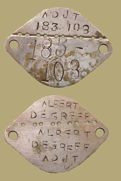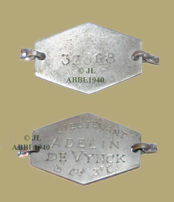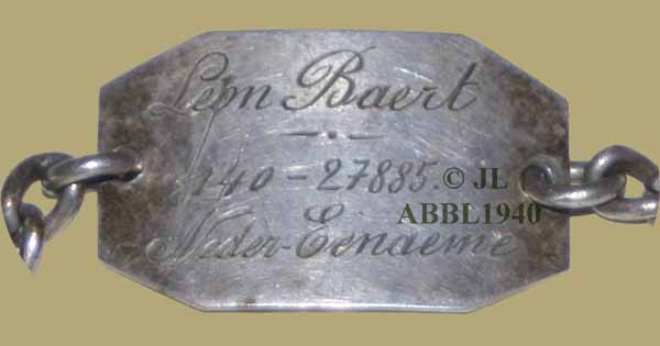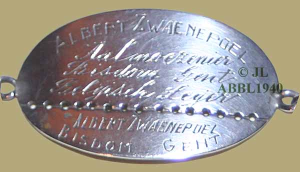 Een verzilverd indentifiecatieplaatje van aalmoezenier Albert Zwaenepoel van het Bisdom Gent. | ||||||||