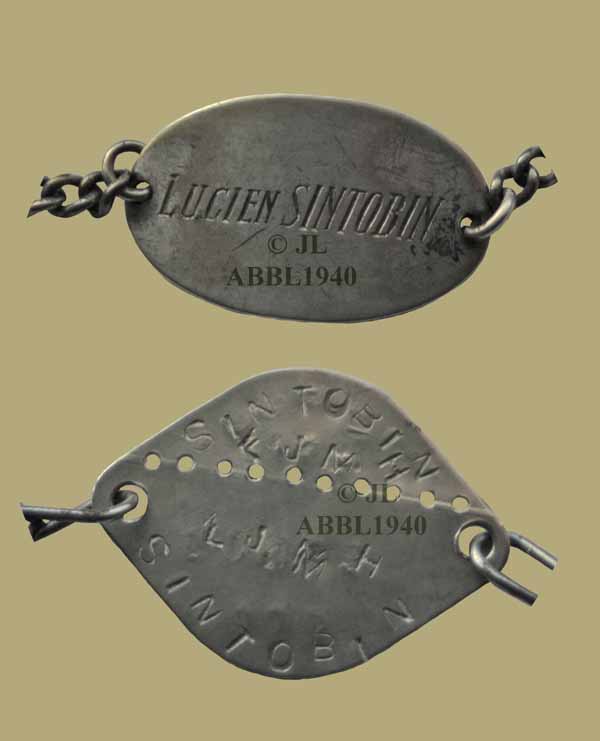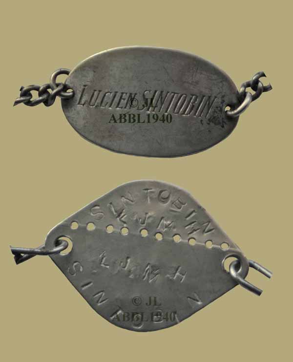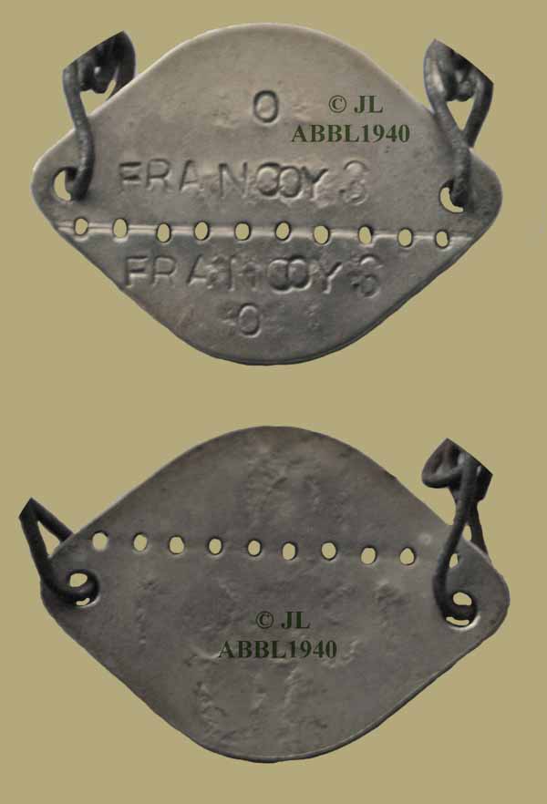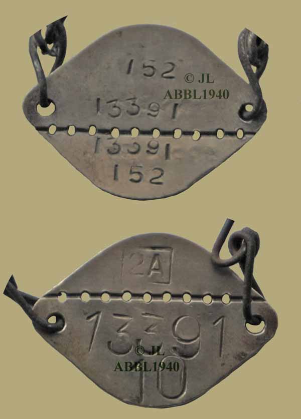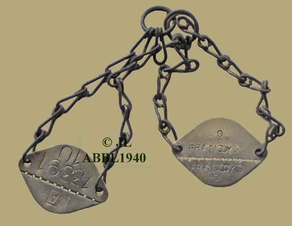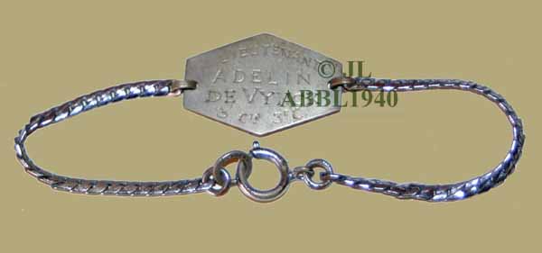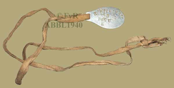 Het model 1915 werd in hetzelfde jaar ingevoerd en was eigenlijk niets anders dan de overname van het Franse model 1881. Dit ovaalvormig kenplaatje werd aan een ketting rond de pols gedragen. |