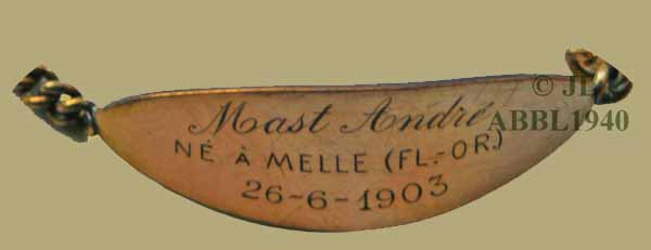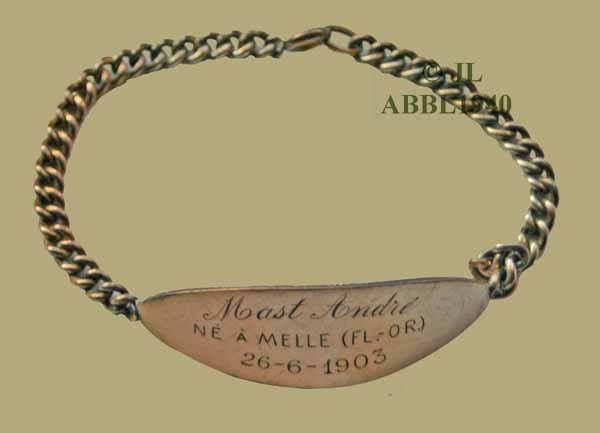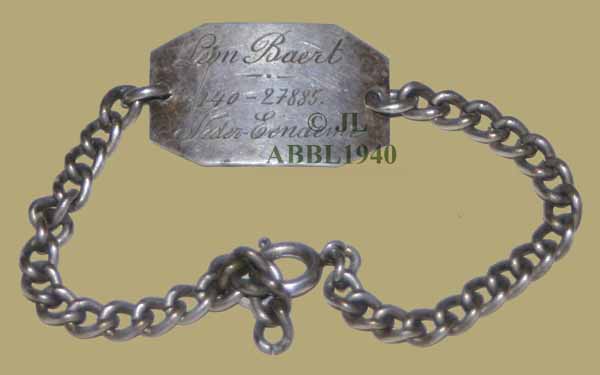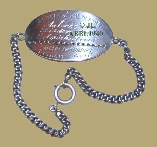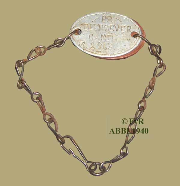 Een privé aangemaakt identificatieplaatje met naam, geboorteplaats en -datum. Ketting en plaat zijn licht verkoperd hetgeen een licht goudkleurige schijn geeft. | ||||||||