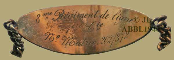 Voor de eerste wereldoorlog kende het Belgische Leger een immatriculatie onder de vorm van een rudimentair eivormig aluminium kenplaatje dat met een plat lint rond de nek werd gedragen. Dit is het model 1889. De aangebrachte gegevens zijn naam, eenheid en nummer. | ||||||||