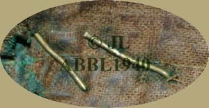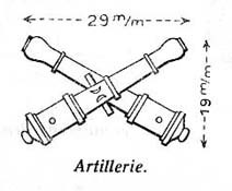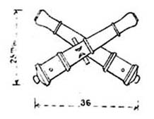 Deze gekruiste kanonnen, van een bonnet de police van een onderofficier van de fortenartillerie, zijn vervaardigd uit dik geelkoper en werden "verzilverd". De bevestiging is met dunne ronde pennetjes. De afmetingen zijn exact zoals voorgeschreven op de schets. De dikte van de kanonloop, net achter de mondingsring is 3,6 mm. |