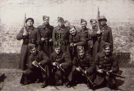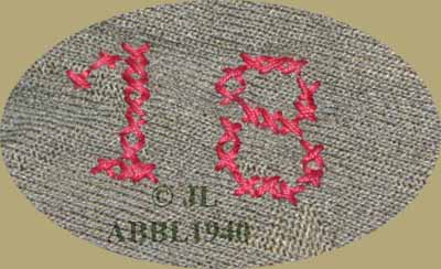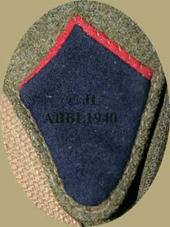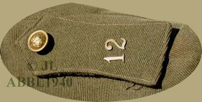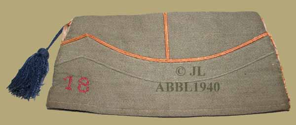 | Deze, volgens het reglement van 1928, bonnet de police heeft geen metalen regimentsnummers maar een met rode draad geborduurde nummering. Het gaat hier dan ook om een persoonlijke aanpassing die blijkbaar toegelaten werd voor het uitgangsuniform. | ||