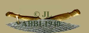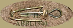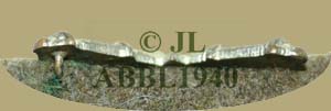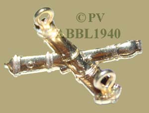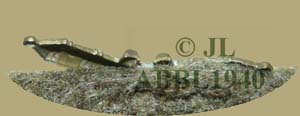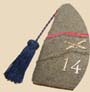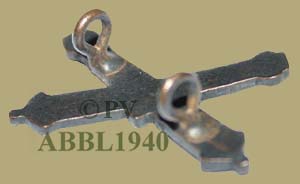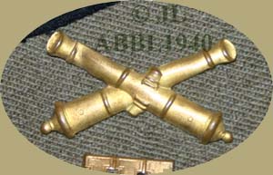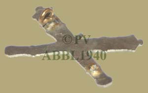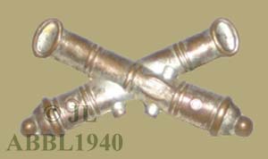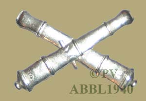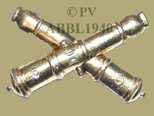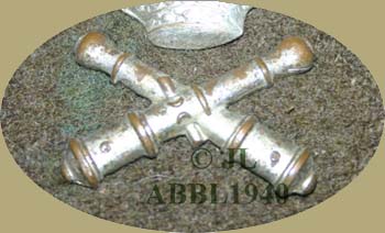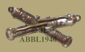 Een tweede model van gekruiste kanonnen, van een soldaat 14e artillerie, ditmaaal met open mond. Het attribuut is gemaakt van dun metaal en hol van binnen. De bevestiging is met twee lussen en een koperen splitpen. De afmetingen bedragen 32,5 mm x 16 mm. |
