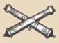 Dit gelijkaardige model van gekruiste kanonnen, gemaakt in dun metaal, heeft als bevestiging twee dunne ronde pennetjes. |
