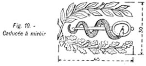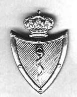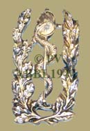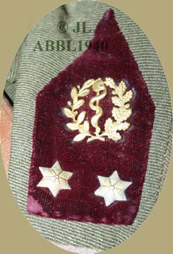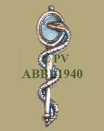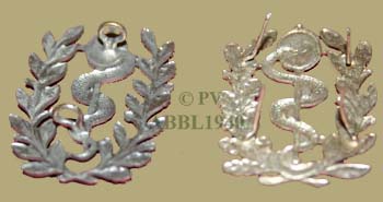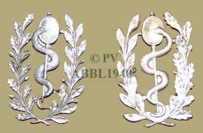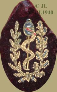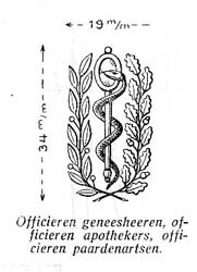 | Officiers, sous-officiers et troupes du Service de Santé, Officiers des services vétérinaire et pharmaceutique: | Le caducée à miroir (la cannnetille brodée du miroir est en argent pour les sous-lieutenants élèves médecins, pharmaciens et vétérinaires) porté horizontalement au collet de la vareuse et de la veste et verticalement au collet de la capote. L'insigne tout entier est brodé argent pour les élèves non officiers; il est en métal blanc pour la tenue de mobilisation |