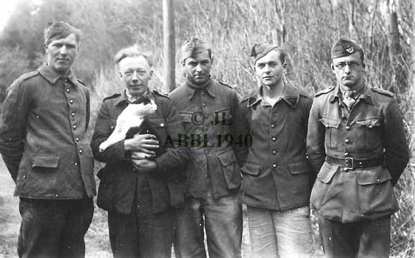 | Franse en Belgische krijgsgevangenen. Een van de Fransen heeft de bonnet de police van de Belg met de eveneens krijgsgevangen poes. De onderofficier uiterst rechts heeft een afwijkend attribuut van het 1e jagers te voet op zijn bonnet de police waar de kwast van verwijdered werd. Reglementair wordt het arabisch cijfer met koningskroon erboven op de bonnet de police gedragen. Hij gebruikt evenwel het oude insigne van "chasseurs", ttz een waldhoorn met arabisch cijfer in verwerkt. Dit model van attribuut werd in mei 1915 ingevoerd en was in mei 1917 reeds afgevoerd. Boven de waldhoorn met cijfer 1 is de koningskroon vaag zichtbaar. Op de kraagpunten van zijn opengedragen jas is nog net de lichtere gele afboording tov de groene spiegel te zien. Hij draagt zijn vest naar officiersmode: open kraag met hemd en das. | ||||||||||||||||||
