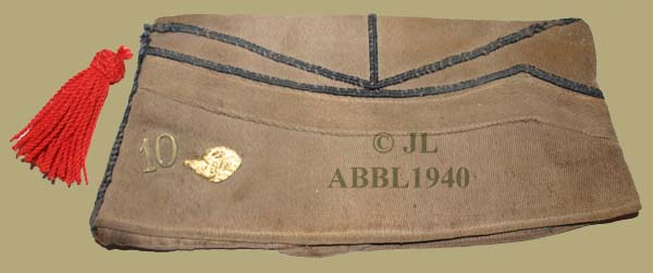 | Bij Koninklijk Besluit van 10 maart 1933 werd bepaald dat het 10 Linie voortaan de benaming "Regiment Ardeense Jagers" zou dragen. Deze bonnet de police van het 10e linieregiment werd mogelijks door een oudgediende aangepast naar een "privé ?" bonnet 10e linie - ardeense jagers. | ||||||||