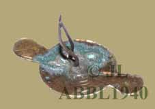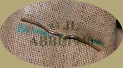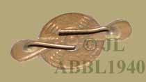 Dun geelkoperen attribuut, bevestiging met twee dunne centraal geplaatste ronde pennen. |