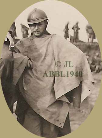 Het is in feite een groot tentzeil met knopen en versterkte ringen die als een soort mantel gedragen wordt. Er is geen speciale voorziening voor het hoofd zoals in latere Belgische modellen. Een deel van het tentzeil wordt gewoon rond de nek geknoopt. De rest sluit aan rond het lichaam met genoeg vrije ruimte om de bewegingsvrijheid van de armen te verzekeren. Een ander model van regenkledij in de vorm van een echte regencape met aangehechte kap is te zien op de rechtse detailfoto. | |||||||||||||||||||||||||||