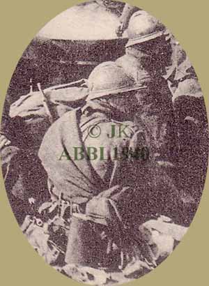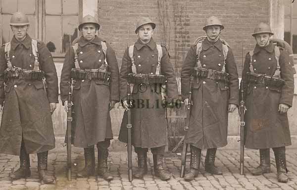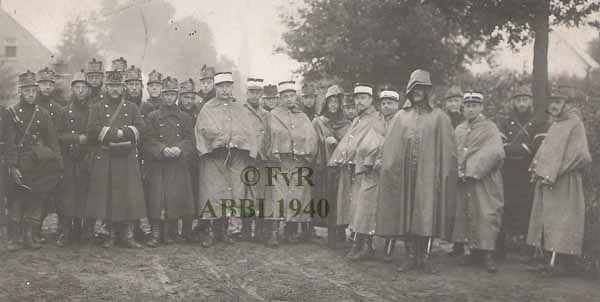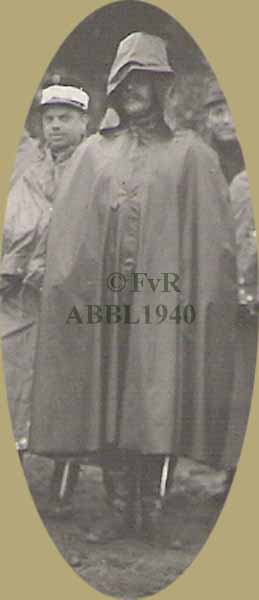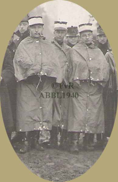 Een tentzeil dat eveneens als regenkledij kon gebruikt worden was reeds voor de eerste wereldoorlog in gebruik. De officieren op onderstaande foto uit augustus 1914 maken gebruik van deze bescherming tegen ons regenklimaat. | |||||||||||||||||||||||||||