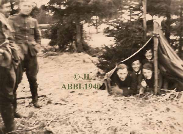 Uit dezelfde reeks van het 13e linie: twee ponchos als schelter. Achteraan bevestigd aan een boom. De voorste steun is niet herkenbaar, mogelijks de tenstokjes. |