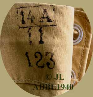 Voor 1937 wordt een tentzeil gemarkeerd met een nummer voor de eenheid en een serienummer van het tenzeil. Dit is niet het stamnummer van de soldaat daar de tentzeilen aan de eenheid toegekend worden en dus geen deel uitmaken van de persoonlijke uitrusting van de soldaat. | |||||||||||||||||||||||||||