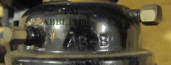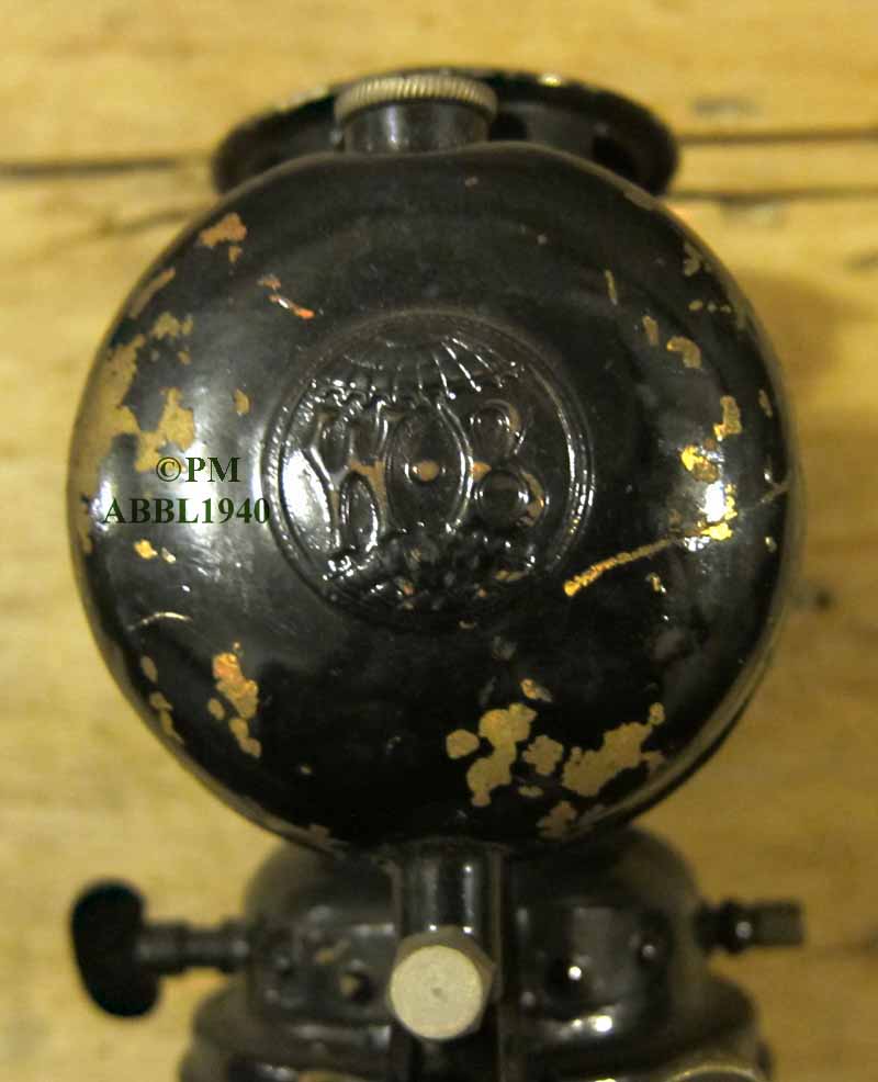 | Acetyleen lamp VITAPHARE, geen chroomafwerking maar zwart gelakt op het koper, volgnummer 179 bovenaan op de lamp en onderaan op de beugel tussen watertank en generator. De lamp en de bevestigingsbeugel zijn gemarkeerd AB BL. | ||||