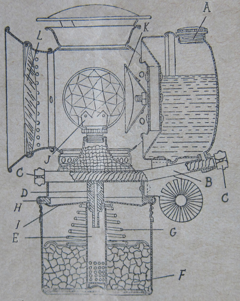 De watertank vullen via de stop met ontluchting (A), het waterkanaal (B) word afgesloten door onderhoudsstopsels (C). De kraan (D), bij Vitaphare vooraan en bij WB aan de zijkant, regelt het druppelen van water in druppelverdeler (E). De Calcium carbide (F) wordt met behulp van een drukplaat met veer (G) naar beneden gehouden, het drukvat wordt afgedicht door een rubberen dichting (H). Het gevormde acetyleengas, reactie van water op calcium carbide, wordt door de geperforeerde plaat (I) naar de brander (J) geperst. De aangestoken vlam wordt met een parabool spiegel (K) door de lens (L) naar buiten geprojecteerd. De grootte van de vlam wordt geregeld door de waterkraan. Het gas voor het achterlicht wordt in de koplamp opgewekt. |
