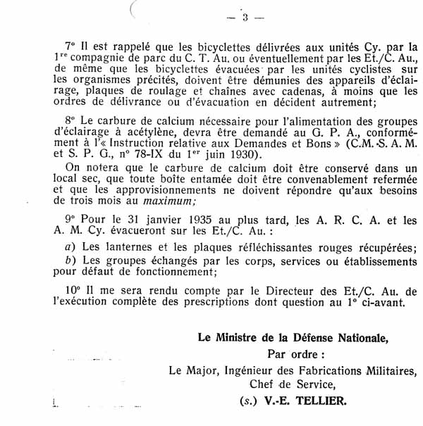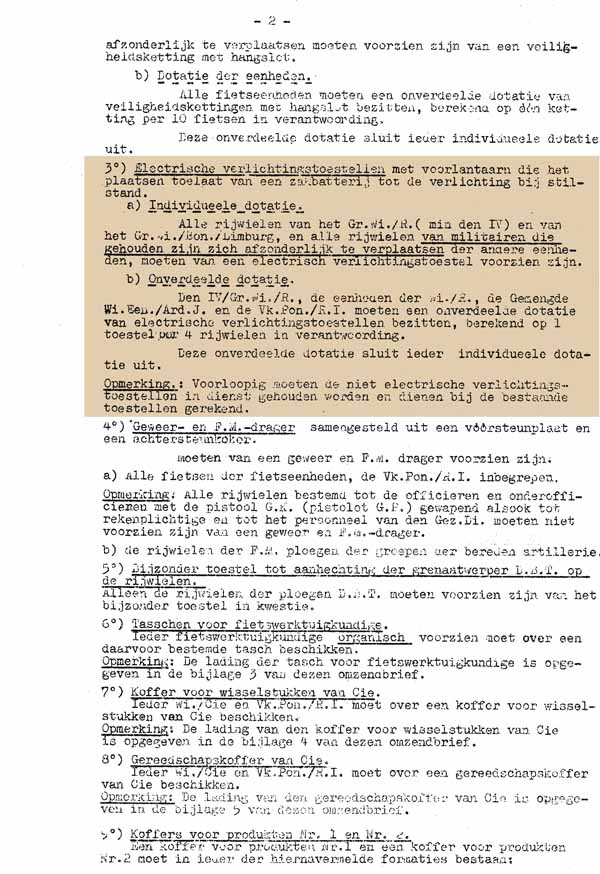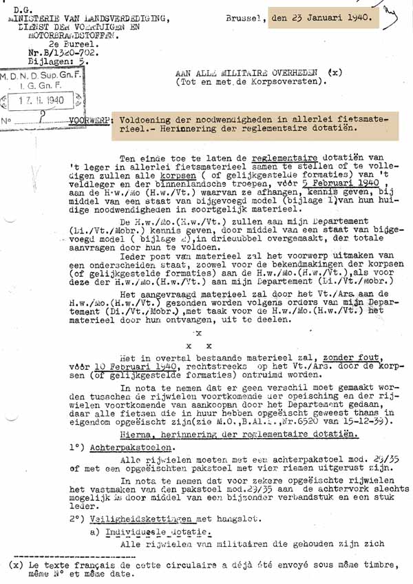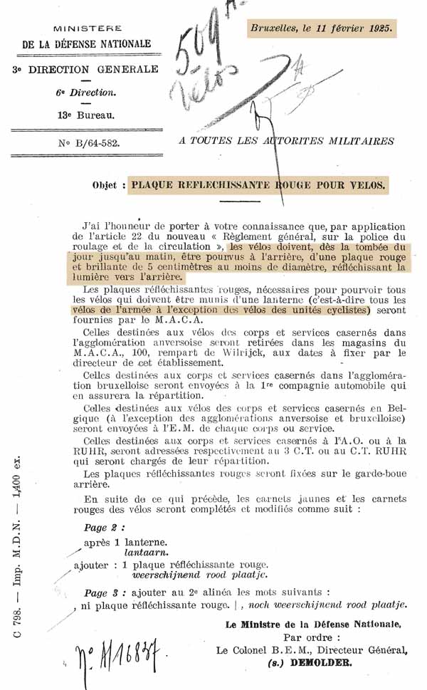 | In een dienstnota van 11 februari 1925 dienen alle fietsen uitgerust te worden met een rode reflecterende plaat van 5 cm diameter. Het gebruik van die reflecterende plaat is verplicht voor alle fietsen van het leger met uitzondering van de fietsen van de cyclisten eenheden. Dit komt erop neer dat alle fietsen van kazernes, officieren, beambten etc.... zo'n plaat dienen te hebben. Fietsen van de regimenten Karabinier Wielrijders dus niet. | ||||