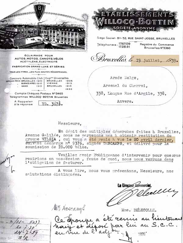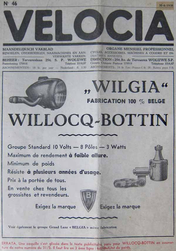 | Op 19 juli 1939 probeert de firma WILLOCQ - BOTTIN een elektrische set WILGIA te recupereren die sedert 20 april 1939 uitgeleend was aan het Belgische Leger. Dit ter studie met het vooruitzicht op de eventuele levering van 10.000 stuks. Er zijn nog enige interne documenten over deze groep maar verder geen beslissing of deze al dan niet aangenomen werd. Evenwel zijn op verschillende foto's uit eind jaren 30 diverse fietsen te zien met een elektrisch voorlicht die hier sterk op lijkt. De afwerking van de lampen is zwart gelakt. | ||||