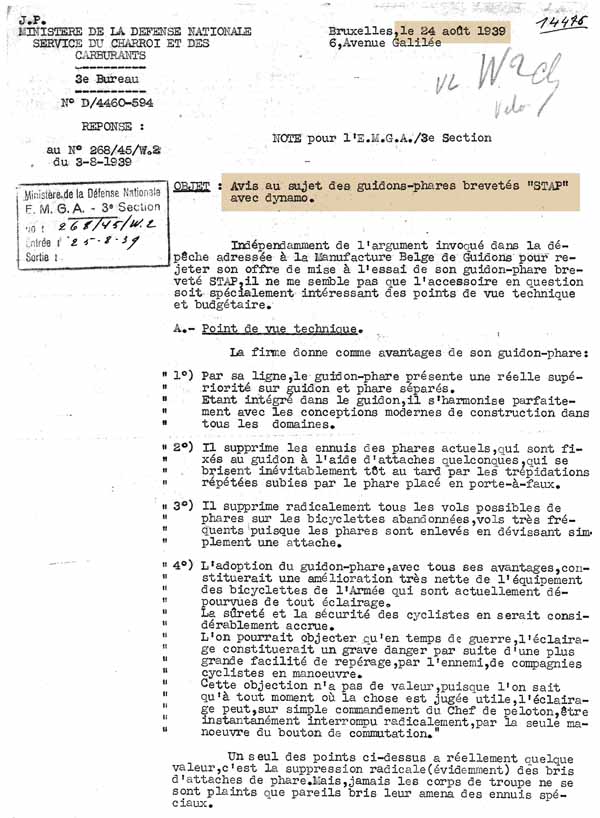 | 24 augustus 1939: verslag van een studie over een stuur met ingewerkt voorlicht, merk STAP. Het systeem biedt geen effectieve praktische meerwaarde en kost bovendien 25% meer dan de bestaande. Het project wordt niet aanvaard. | ||||