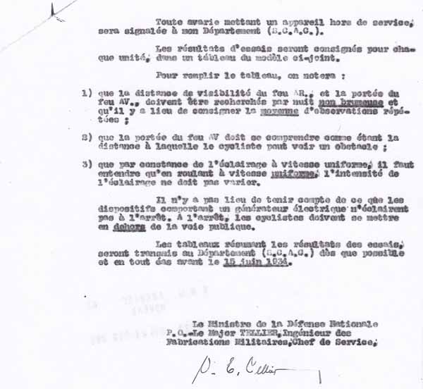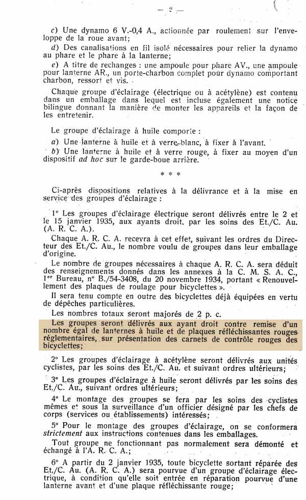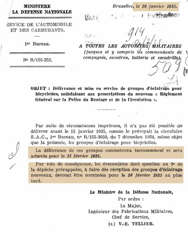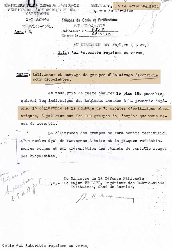 Om te voldoen aan de nieuwe "wegcode" van februari 1934 wordt op 7 december 1934 de nieuwe fietsverlichting officieel in dienst genomen.