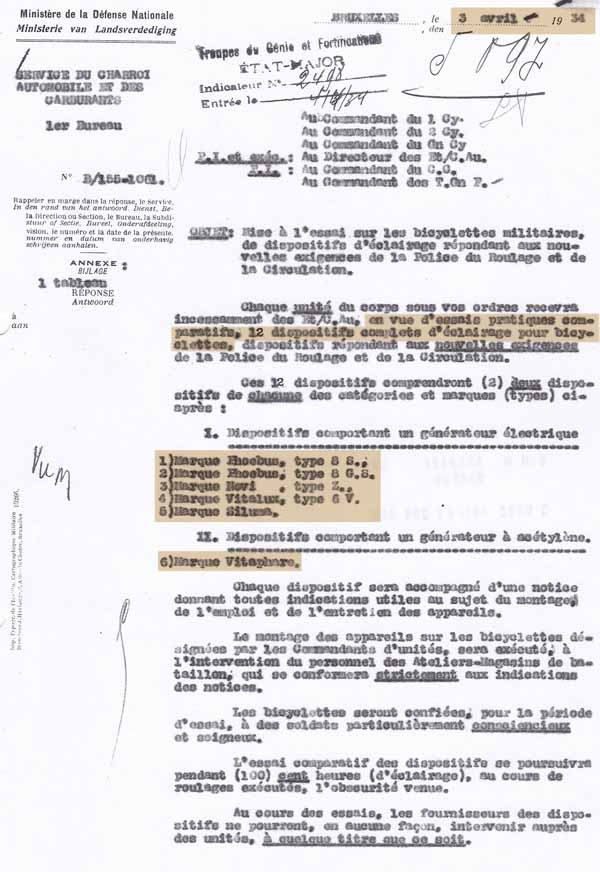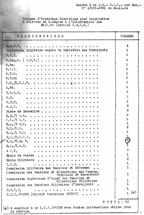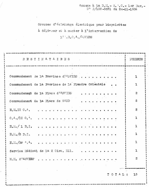 | 24 november 1934. Uit een lot van 100 sets elektrische fiets verlichting dienen er 75 verdeeld te worden onder 65 verschillende diensten en eenheden. Merk en type ontbreken, maar uit latere documenten blijkt dat het om een VITALUX 6 V systeem gaat. | ||||