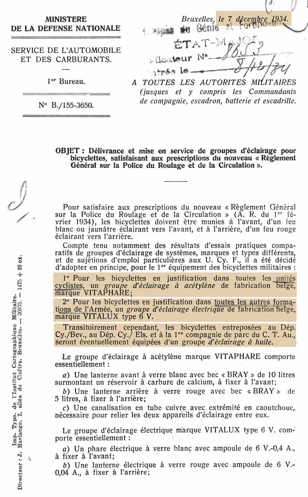 | Het Belgische leger is met zijn verouderde acetyleenlampen wel een buitenbeentje voor wat betreft de verlichting van militaire fietsen. In Engeland past men fietsverlichting met batterijen toe, in Duitsland gebruikt men elektrische verlichting met dynamo. Nochtans kwamen er bij de testen in 1934 reeds elektrische verlichting in aanmerking die uiteindelijk slechts gedeeltelijk toegepast werd op niet direct "strijdende eenheden". De diverse wielrijders eenheden behouden in 1935 de oude acetyleenlampen. De situatie verandert wel als midden 1939 voorzien wordt om 10.000 fietsen uit te rusten met elektrische verlichting van het merk WILLOCQ-BOTTIN. | ||||