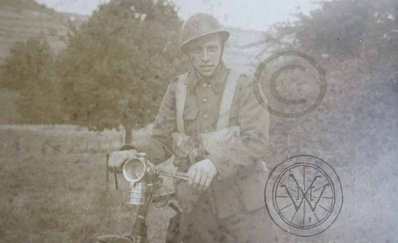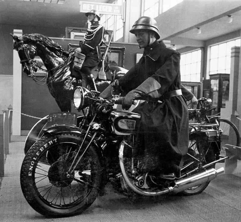 | Niet nader bepaald merk. De foto dateert uit 1939, rechts achter de motorrijder ziet men nog net het stuur van de fiets met een FM30 in het lederen draagstel. De koplamp is verchroomd. | ||||