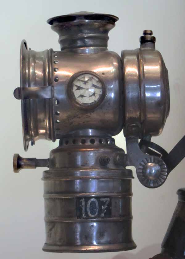 | Een acetyleen achterlicht, verchroomde versie, samen met de rubberdarm nog net waarneembaar op de rechterfiets. | ||||